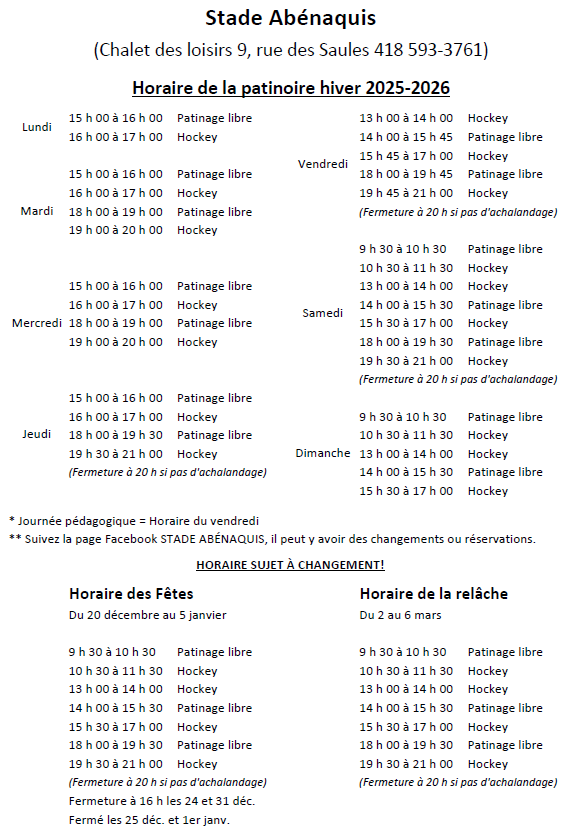 Stade AbénaquisCoordonnéesChalet des loisirs, 9, rue des Saules 418 593-3761 Comité Loisirs et culture de Sainte-Aurélie Pour tous les détails, suivez le site Facebook du Stade Abénaquis. Patinoire (Stade Abénaquis)Tarifs 2025-2026